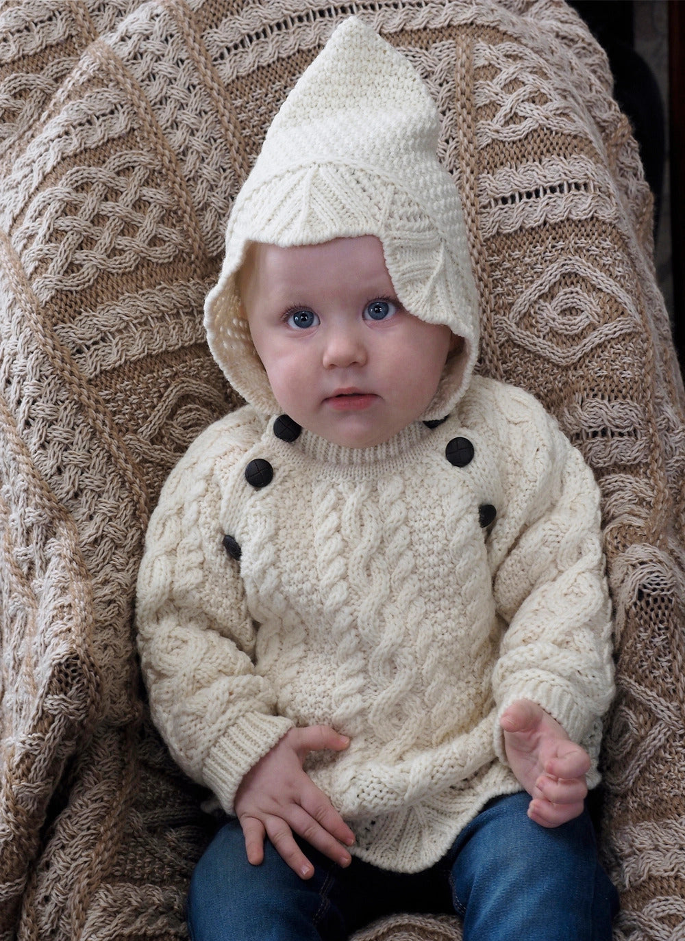 Dress your wee lad or lassie in this adorable Irish Knit Hoodie. It’s a lovely natural ivory shade of soft merino wool, and features buttons. It’s the perfect sweater for cooler weather and will keep your baby nice and warm all Fall and Winter Long. The accent buttons and Irish lace-like trim give this sweater character and make any baby look extra adorable!