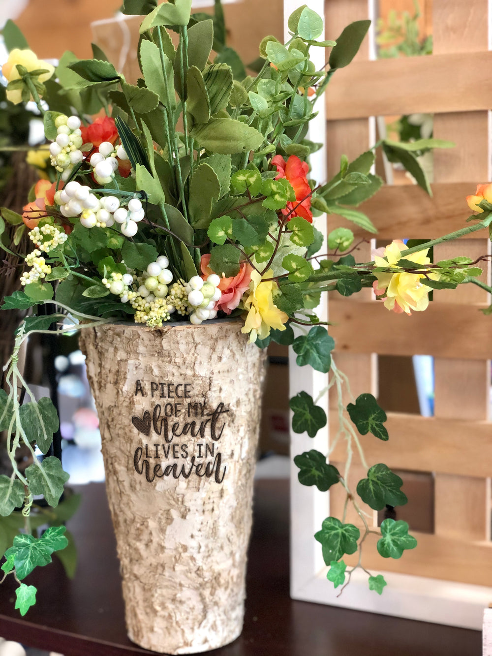 Display your seasonal favorites in this beautiful memorial Engraved Birch Vase! This lightweight tin-insulated vase is wrapped in real birch bark and laser engraved with the loving quote "A Piece of My Heart Lives in Heaven". This vase pairs very nicely with our Caridnal Engarved Wood Log.