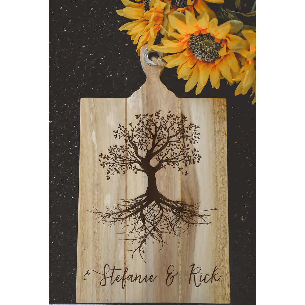 Personalize this gorgeous 18.75"L x 10.40"W x 1.5"H cutting board for the chef in your life! Laser engraved with two first names and the image of the family tree, this acacia cutting board is a beautiful personal touch to any kitchen.