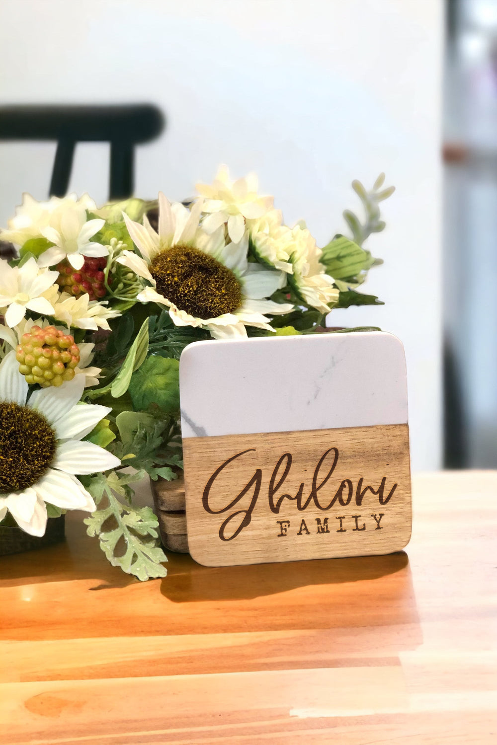 Personalize these 4"x4"x0.5" marble and wood coasters which are perfect for your entertaining needs! Laser engraved with the template of your choice, these coasters are decorative pieces you can leave out even when not in use.