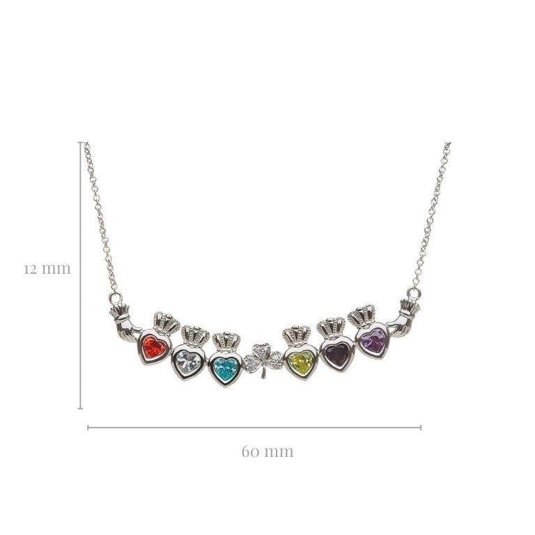 The Six Stone Shamrock Mother’s Pendant Necklace is Celtic jewelry for the mother of six children. The heart-shaped birthstones signify the children. The crowns symbolize the mother’s pride in her young ones. Moreover, the shamrock symbolizes the mother’s love, faith and hope for her children. Additionally, the crowned heart and hands signify love and loyalty. In short, this exquisite necklace echoes maternal love and protectiveness.
