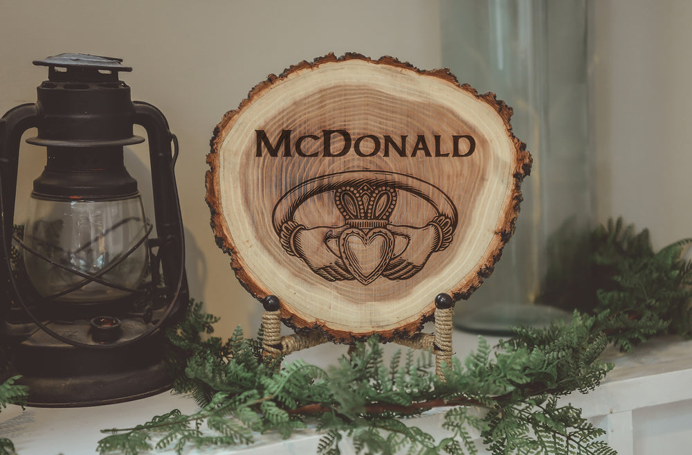 This design features the family's last name and the image of the claddagh. No two wood pieces are alike, making this a special work of art created just for you!